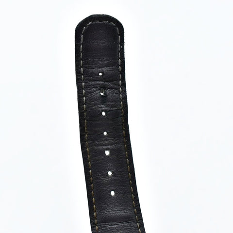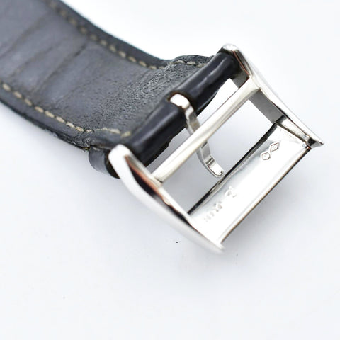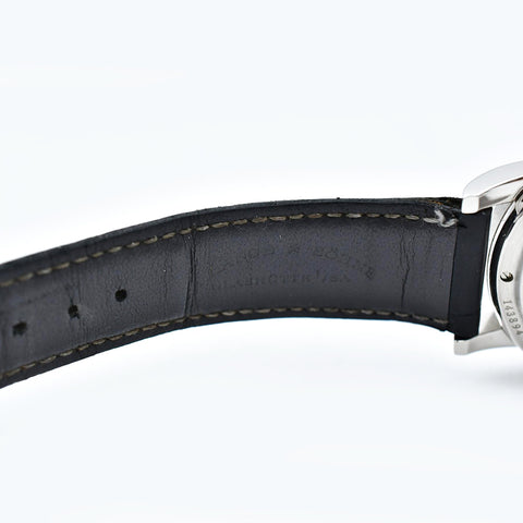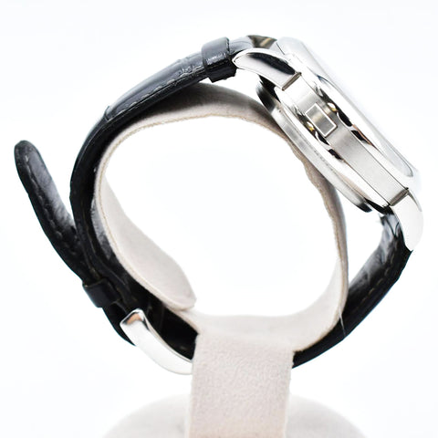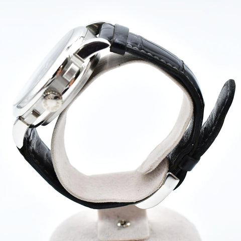 Platinum 39 mm case. Black colored dial, silver sub-dials with applied Roman numeral and stick hour markers. Patented large double window date display located at the top of the dial with quick correction button located on the case edge at the 10 o`clock position. Chronograph movement with fly-back function – allowing the stop-watch to be instantaneously restarted for continuous timing, without having to stop, reset and then restart the chronograph. Furthermore, the minute hand of the chronograph jumps in 1 minute increments rather than continuously moving – this allows for accurate reading of the timing function. Black leather strap with platinum pin buckle. The movement has 40 jewels and beats at 18,000 vph.