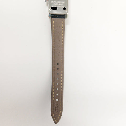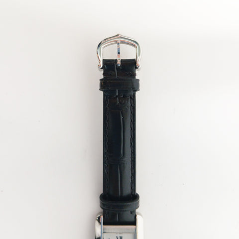 Stainless steel 19mm x 34.8mm case with stainless steel crown. Stainless steel bezel. Silver colored dial with Roman numeral hour markers. Hours, minutes and seconds. Battery operated quartz movement. Crocodile leather strap with steel buckle. Water resistant up to 30 meters / 100 feet.