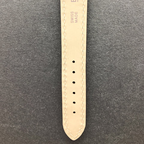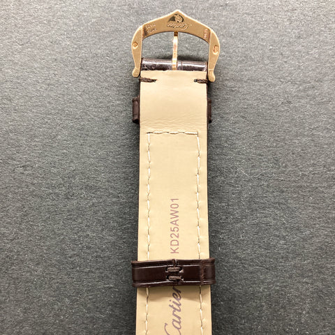 18kt yellow gold rectangular 23 × 29.5 mm case. Silver colored dial with black Roman numeral hour markers and sword shaped blue hours and minutes hands. 18k yellow gold bezel. 18k yellow gold crown set with a sapphire. Battery operated quartz movement. Brown crocodile leather strap with 18k yellow gold pin buckle. Waterproof 30m/100ft.