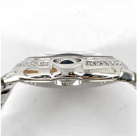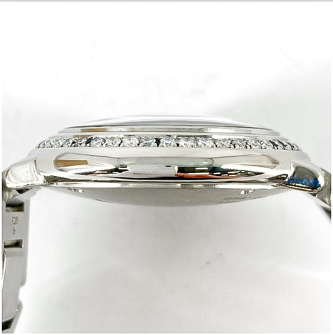 Stainless steel round shape 28mm case. Silver colored dial, with black Roman numeral hour markers and blue hour and minute. Stainless steel bezel set with 30 round cut diamonds. Automatic movement. Stainless steel bracelet with hidden deployment buckle.