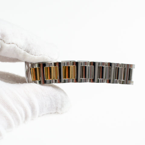 Stainless steel round shape 29mm case. Silver colored dial, with black Roman numeral hour markers and blue hour and minute. Stainless steel bezel. Swiss quartz battary operated movement. 18kt yellow gold crown. 18kt yellow gold and Stainless steel bracelet with hidden deployment buckle.