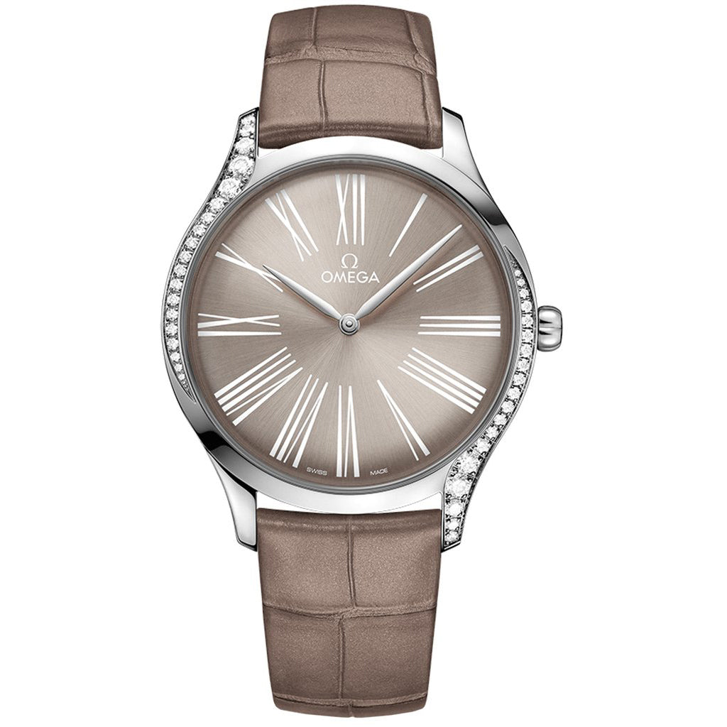 Stainless steel 39mm case. Stainless steel fixed bezel with diamonds. Taupe/brown lacquered dial with Roman numeral hour markers. Quartz battery operated movement, Caliber 4061. Hours and minutes. Light brown crocodile leather strap with stainless steel pin buckle. Water resistant up to 30m / 100ft.
