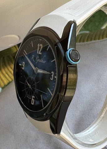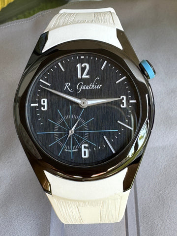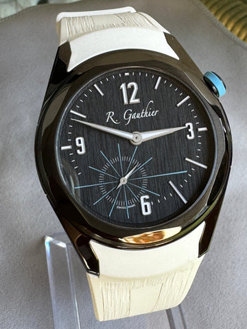Black Grade 5 Titanium 41mm case, 49.5mm lugs to lug, 9.55mm case in black Grade 5 Titanium. Framing the dial is a titanium bezel coated with a technical ADLC treatment allowing an aesthetically black finish whose eye-catching, geometric profile is unlike anything previously seen on a Romain Gauthier timepiece. In between the bezel and case-back also coated with a technical ADLC treatment, the one-piece case band and lugs are geometrically sculpted, with satin and polished finishes as well as aesthetic grooves cleverly deployed to draw out the resulting shapes. Hours, minutes, small seconds. The tapering, three-dimensional hands and index are made from 18k white gold and filled with Super-LumiNova, as are the numerals and applied hour markers, each of which has been produced from a single piece of white gold and features beveled edges to give a punchy presence.