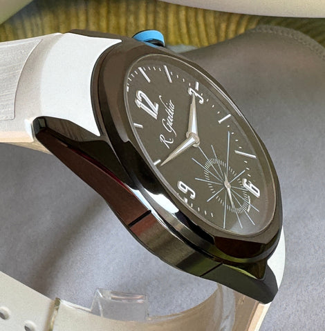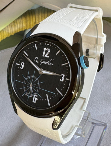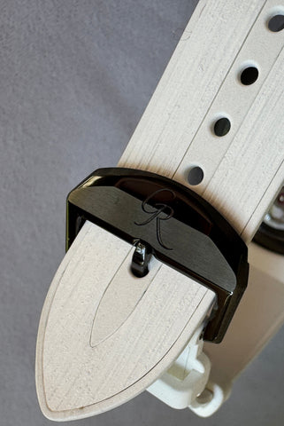 In-house-hand-wound natural Grade 5 titanium movement 60-hour power reserve. White Rubber strap with black ceramic pin buckle. Additional black rubber strap.