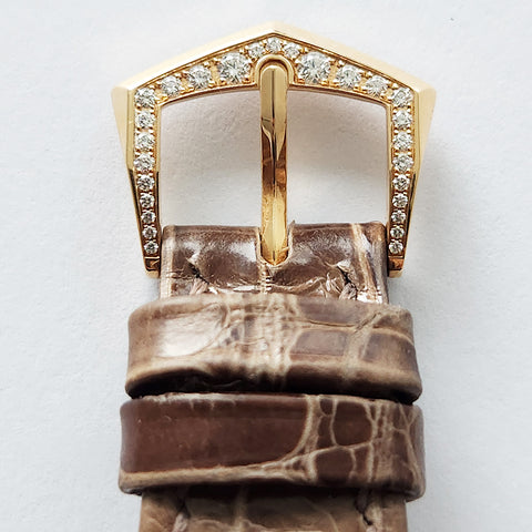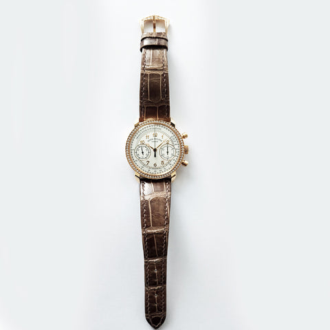 18kt rose gold 38mm case with a leather strap and 18k rose gold buckle. 18k rose gold bezel set with 72 round cut diamonds (approxomate 0.78 ct.tw). Manual wind movement, Caliber CH29-535 PS. White dial. Hours, minutes, seconds and chronograph functions. Power reserve up to 65 hours. Water resistant up to 30 meters.