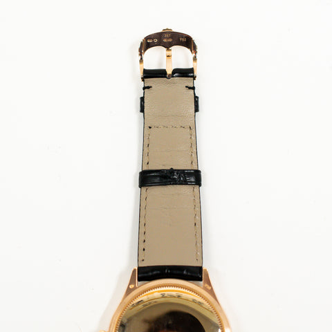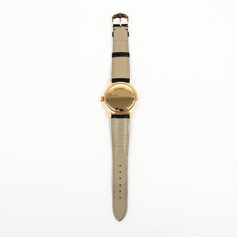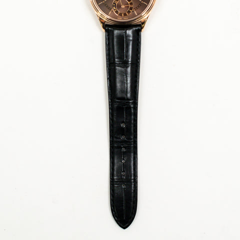 18kt rose gold 39mm case with 18k rose gold crown. 18k rose gold bezel. Brown Guilloche colored dial with index hour markers. 18k rose gold hands. Hours, minutes, seconds, am/pm indicator and GMT (second time zone). Automatic chronometer movement. Crocodile leather strap with 18k rose gold buckle. Power reserve up to 48 hours. Water resistant up to 50m/150ft.