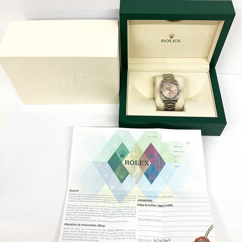 34mm stainless steel case. Sapphire crystal. High polished stainless steel smooth domed bezel. Salmon pink color dial with luminescent index and Arabic numeral hour markers. Stainless steel Oyster bracelet with double safety hidden buckle. Rolex Automatic 31 jewel movement. Water resistant to 100 meters or 330 feet.