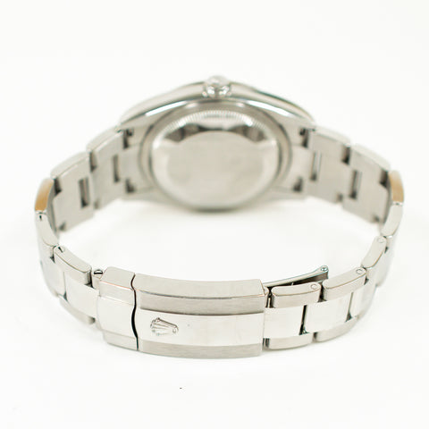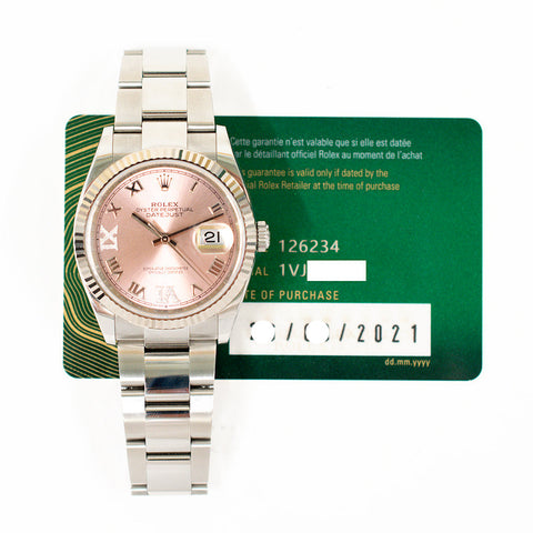 Stainless Steel 36 mm case. 18kt white gold fluted bezel. Pink dial with raised Roman Numerals and pave Diamond VI and IX hour markers. Stainless Steel hour, minute and second hands. Date display window at 3 o’clock position. Screw-down crown. Automatic 31-Jewel Chronometer movement. Stainless steel oyster bracelet. Hidden deployment buckle.