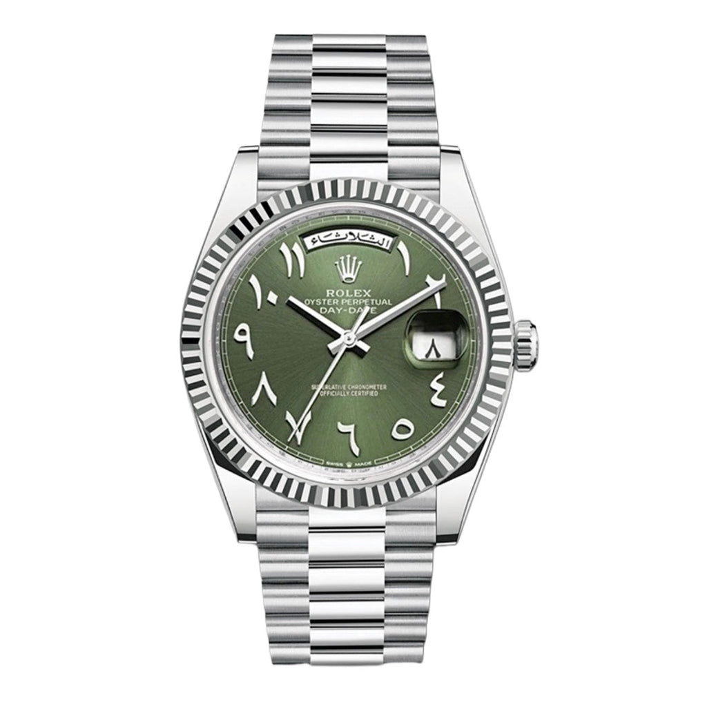 Platinum 40mm case with Platinum crown. Platinum fluted bezel.special Arabic dial, special Arabic numerals and Day Date indicators. Platinum hour, minute and second hand. Date window at 3 o'clock aperture. Day window at 12 o'clock. Minute markers around the outer rim. 18k white gold hands. Hours, minutes, seconds, day and date. Date display window located at the 3 o’clock position. Automatic 31-Jewel chronometer movement. Platinum president bracelet.