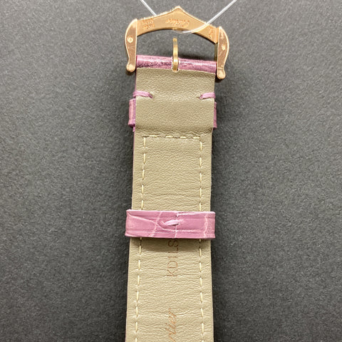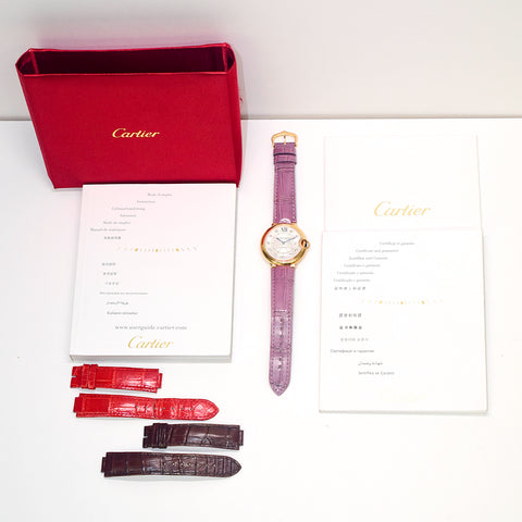 18kt rose gold 36.2mm case. Silver colored dial with 11 diamond hour markers and a black Roman numeral 12 o'clock hour marker. Blue hours and minutes hands. 18k rose gold bezel. Cartier caliber 076 automatic movement. Purple crocodile leather strap with 18k yellow gold ardillon buckle. Water resistant 30m/100ft.