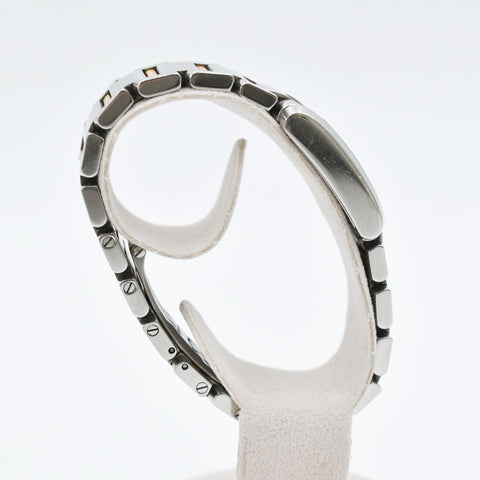 Stainless steel 25mm x 20mm case. 18k rose gold crown with sapphire cabochon. Silver colored dial, with diamond hour markers and Roman XII hour, minute and second hands. Swiss quartz battery operated movement. 18k rose gold and stainless steel bracelet with hidden deployment buckle.