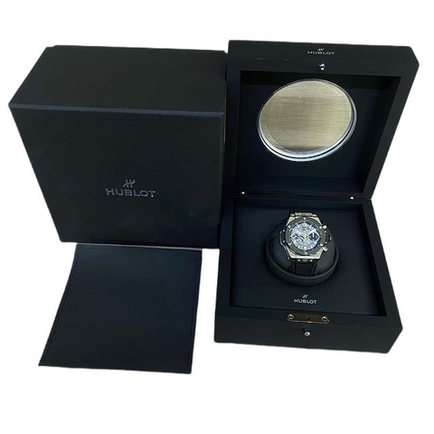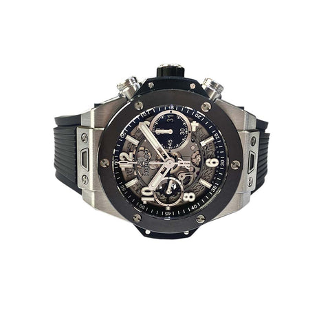 Titanium 42mm case with titanium crown and pushers. Black Ceramic fixed bezel with 6 titanium screws. Skeletonized dial with luminous index and Arabic numeral hour markers with semi-skeleton hands. Hours, minutes, seconds, date and chronograph. Date window located at the 3 o'clock position. Automatic chronometer movement, Caliber HUB 1280. Rubber strap with titanium push button foldover clasp. Water resistant up to 100m / 330ft.
