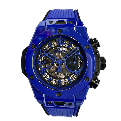 Blue Ceramic 42mm case with black pvd crown. Blue Ceramic fixed bezel with 6 H-shaped black-plated titanium screws. Black and red skeleton dial with Arabic numeral and index hour markers with. Hours, minutes, seconds, date and Flyback chronograph. Date display window located at the 3 o'clock position. Hubolot HUB1280 UNICO manufacture self-winding chronograph flyback movement, approximately 72 hours of power reserve. Blue rubber strap with black ceramic deployment buckle clasp. Water resistant up to 30m / 100ft.