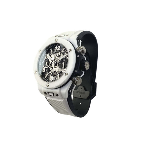 White Ceramic 42mm case with black pvd crown. White Ceramic fixed bezel with 6 H-shaped black-plated titanium screws. Black skeleton dial with Arabic numeral and index hour markers with. Hours, minutes, seconds, date and Flyback chronograph. Date display window located at the 3 o'clock position.  Hubolot HUB1280 UNICO manufacture self-winding chronograph flyback movement, approximately 72 hours of power reserve. White rubber strap with black ceramic deployment buckle clasp. Water resistant up to 30m / 100ft.