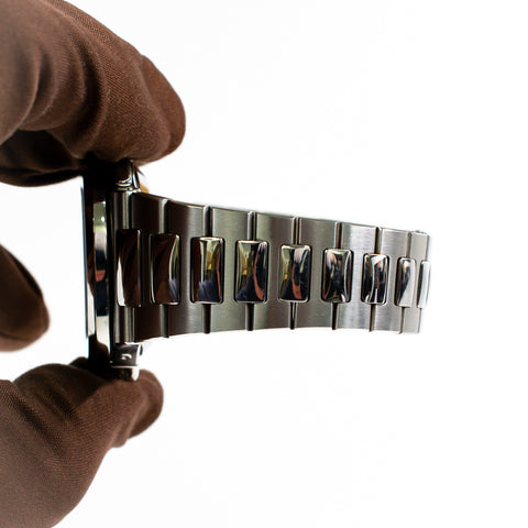 Stainless steel 38.5mm x 44mm case. Stainless steel bracelet. Black/greyish dial. Fixed bezel. Scratch Resistant Sapphire crystal. Deployment clasp. Automatic movement. Water Resistant to 120m / 400ft. Hour/minute hands and hour markers in 18k white gold. 55-hour power reserve.