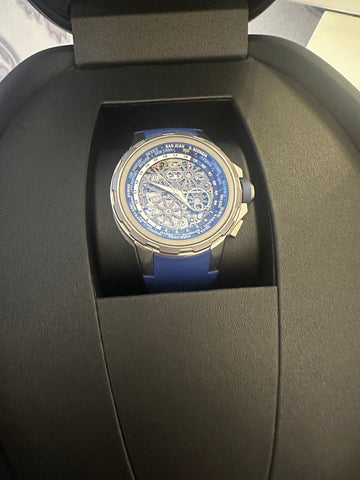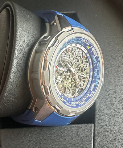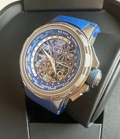 Titanium 42.7mm case. Titanium crown. Titanium bezel. Blue Rubber strap. Skeleton dial with white luminescent Arabic numeral hour markers. Automatic movement, Caliber RMXP1. Power reserve up to 42 hours. Hours and minutes. Water resistant up to 30 meters.