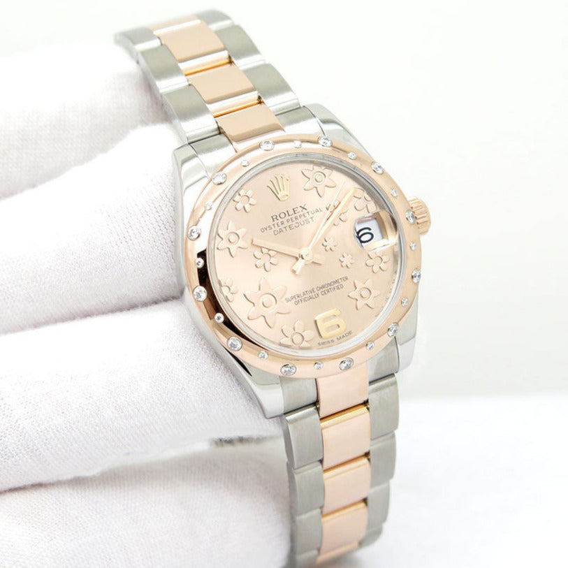 Stainless steel 31mm case. 18kt rose gold domed bezel with 24 diamonds. Gold color dial with Roman number 6 hour marker and flower 18k rose gold hour, minute and second hands. Date display window at 3 o’clock position. Screw-down 18k rose gold crown. Automatic 31-Jewel Chronometer movement. 18k rose gold and stainless steel Oyster bracelet with hidden deployant buckle. Water resistant 100m/300ft.