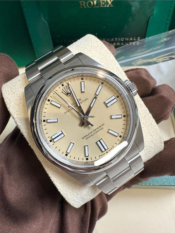 Stainless steel 41mm stainless steel case with stainless steel crown. Scratch resistant sapphire crystal. Stainless steel domed bezel. Beige colored dial with luminescent index hour markers and hands. Hours, minutes and seconds. Automatic Caliber 3230 movement with 70mhour power reserve. Stainless steel Oyster bracelet. Water resistant up to 100m / 300ft.