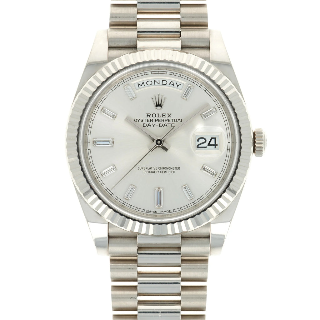 18kt white gold 40mm case with 18k white gold crown. 18k white gold fluted bezel. Silver color dial with raised baguette diamond hour markers and 18k white gold hands. Hours, minutes, seconds, day and date. Date display window located at the 3 o’clock position. Automatic 31-Jewel chronometer movement. 18k white gold president bracelet.