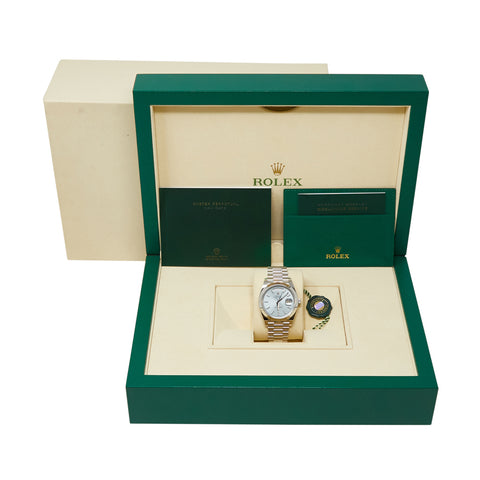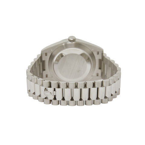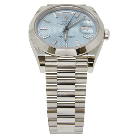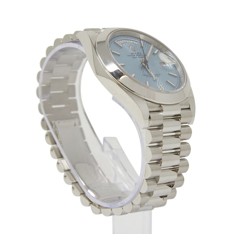 Platinum 40mm case with platinum crown. Platinum fixed bezel. Ice Blue Diagonal Motif dial with luminescent stick hour markers and hands. Hours, minutes, seconds, day and date. Date display window located at the 3 o’clock position. Automatic 31-Jewel chronometer movement. Platinum president bracelet.