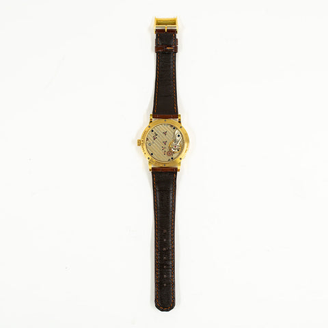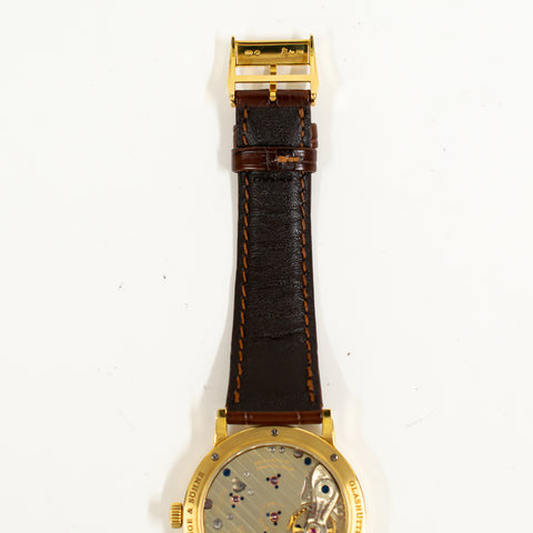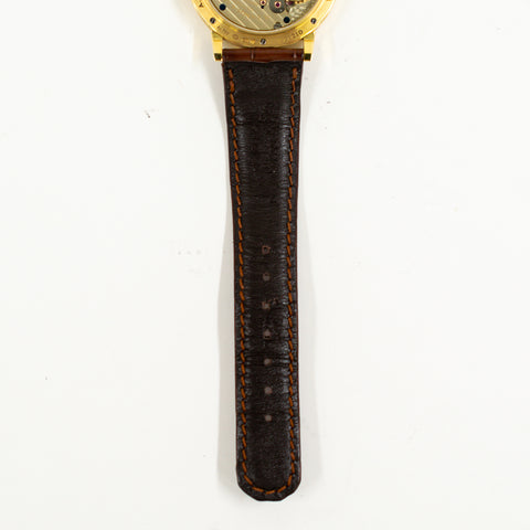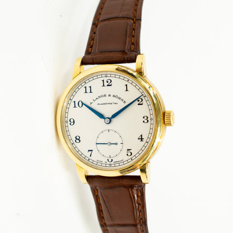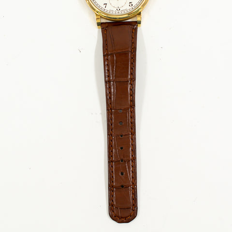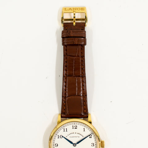 18kt yellow gold 38.5mm case with 18k yellow gold crown. 18k yellow gold bezel. Silver colored dial with Arabic numeral hour markers and blued hands. Hours, minutes and small seconds. Manual wind movement, Caliber L051.1. Crocodile leather strap with 18k yellow gold pin buckle. Power reserve up to 55 hours. Water resistant up to 30m / 100ft.