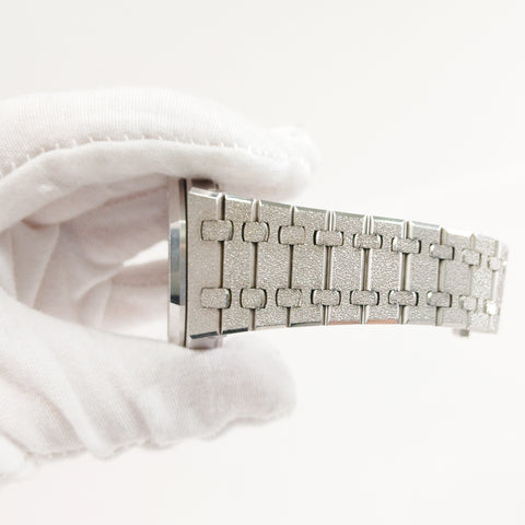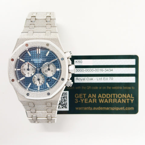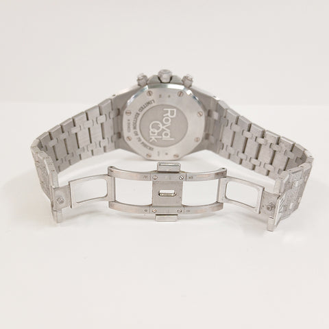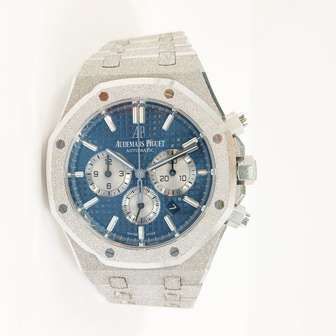 18kt white frosted gold 41mm case with 18k white frosted gold crown and pushers. 18k white frosted gold fixed bezel. Grey colored dial, silver subdials with 18k white gold luminous index hour markers and hands. Hours, minutes, seconds, date and chronograph. Date window located between the 4 and 5 o'clock position. Automatic movement, AP Caliber 4401. 18kt white frosted gold bracelet and clasp. Power reserve up to 70 hours. Water resistant to 50m or 160ft.