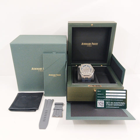 Stainless steel 42mm case. Stainless steel bezel with white screws. Grey dial with “Méga Tapisserie” pattern, white gold applied hour-markers and Royal Oak hands with luminescent coating, blue rotating inner bezel with zone from 60 to 15 minutes in white, luminous hour markers and luminescent hands. Window date display at 3 o’clock position. Automatic movement, caliber 4308. Grey color rubber strap with stainless steel pin buckle. Hours, minutes, seconds and date. Water resistant up to 300 meters / 1000 feet.