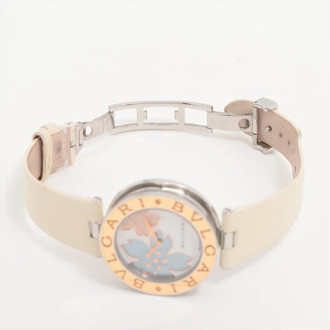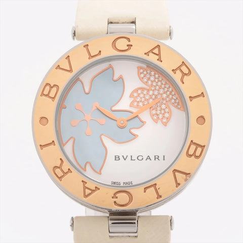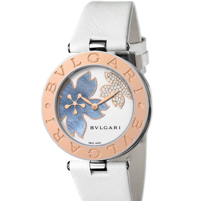 Stainless steel 35mm case. 18kt rose gold bezel engraved with "Bvlgari". White colored dial with diamond flower motif and large blue mother of pearl flower motif. Hours and minutes. Swiss battery operated quartz movement. Calfskin leather strap with stainless steel deploy buckle. Water resistant up to 30m / 100ft.