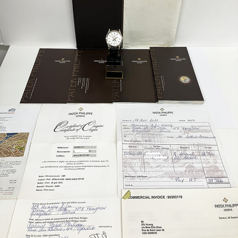 18kt white gold 38mm case. Automatic movement, Patek Caliber 324 S QA LU 24 with 34 jewels. Silver opaline dial. Hours, minutes, seconds, date, day, month, 24 hour display and moon phase. Black leather strap with 18k white gold buckle. Power reserve up to 45 hours. Water resistant up to 25 meters.