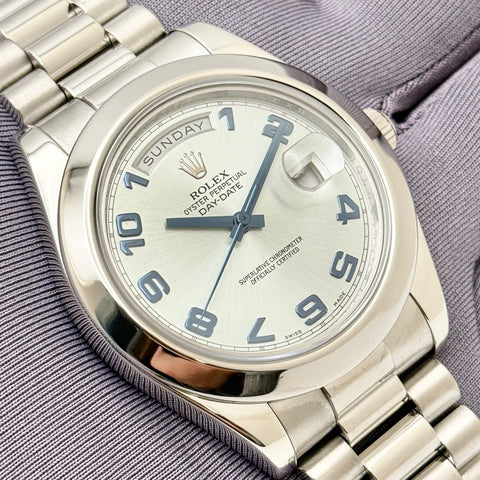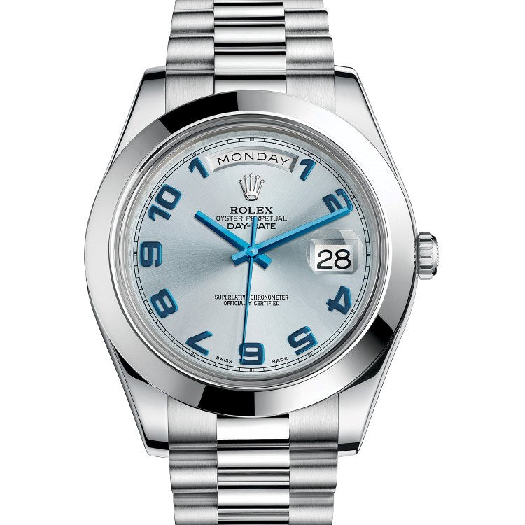 Platinum 41 mm case. Platinum polished bezel. Ice blue dial with Arabic numeral hour markers. Platinum hour, minute and second hands. Date display window at 3 o’clock position and week display at 12 o’clock. Screw-down platinum crown. Automatic 31-Jewel Chronometer movement. Platinum President bracelet with hidden deployant buckle. Water resistant 100m/330ft.
