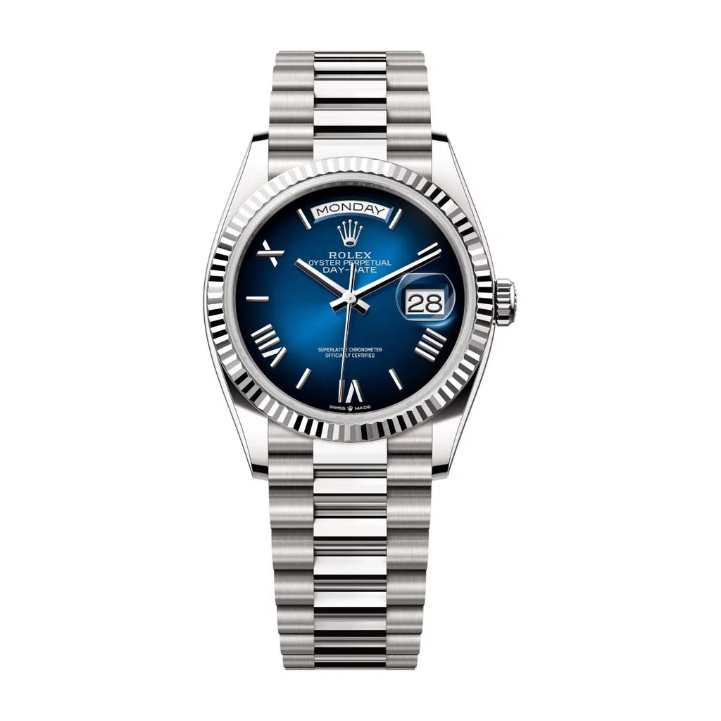 18kt white gold 36 mm case. 18k white gold fluted bezel. Blue colored Ombre dial with Raised gold roman numeral hour markers. White gold color hour, minute and second hands. Date display window at 3 o’clock position, day of the week display at 12 o’clock position. Screw-down 18k white gold crown. Automatic 31-Jewel Chronometer movement. 18k white gold President bracelet. Water resistant 100m/330ft.